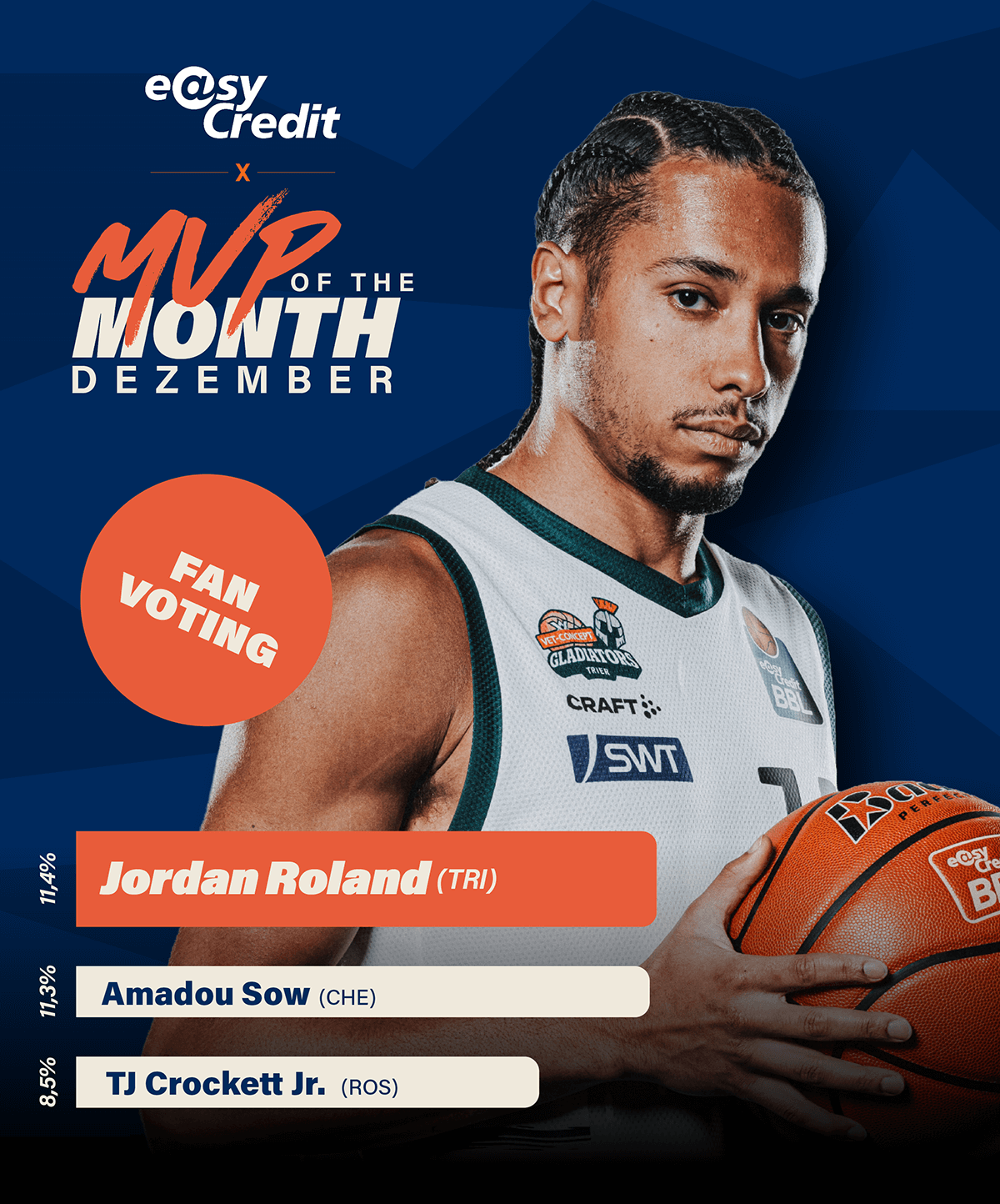 Der 1,85 m große Jordan Roland wurde im Dezember 2025 erstmals zum easyCredit BBL MVP of the Month gewählt. Mit durchschnittlich 20,6 Punkten absolvierte der 28-jährige Point Guard einen herausragenden Monat für die VET-CONCEPT Gladiators Trier. Besonders kurz vor dem Jahresende setzte der gebürtige US-Amerikaner zwei deutliche Ausrufezeichen: 24 Punkte gegen den FC Bayern Basketball am 28. Dezember sowie 26 Punkte gegen die NINERS Chemnitz am 30. Dezember. Mit diesen Leistungen sicherte er sich wahrscheinlich die entscheidenden Stimmen für die Auszeichnung und unterstrich eindrucksvoll seine Bedeutung im Team der Trierer.