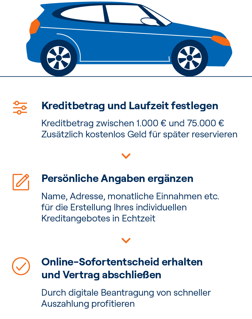 Wunschbetrag und Laufzeit wählen, Antrag ausfüllen und sofort erfahren ob’s klappt.