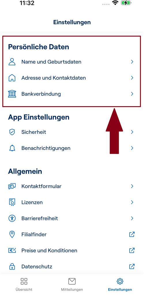 Loggen Sie sich zunächst in der App bzw. im Kundenportal ein. Auf der Startseite wechseln Sie im Navigationsmenü unten von Übersicht auf Einstellungen.