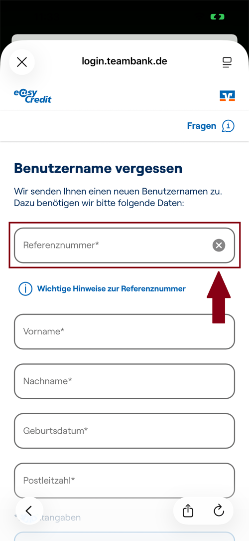 - Geben Sie Ihre 10-stellige Kundennummer an. Haben Sie nur Ihre Referenznummer zur Hand, können Sie damit über „Benutzerkennung vergessen“ Ihre Kundennummer anfordern.